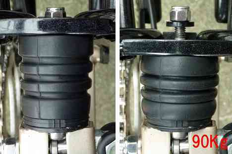 左側は体重をかけていない状態。右は体重をかけて走行していない状態。私の体重は現在70Kg なのでやはりソフトタイプではサスペンションが完全につぶれてしまって、走行中に衝撃があっても、これ以上に縮むのは難しいためショックを受けきれないのではと思われる。