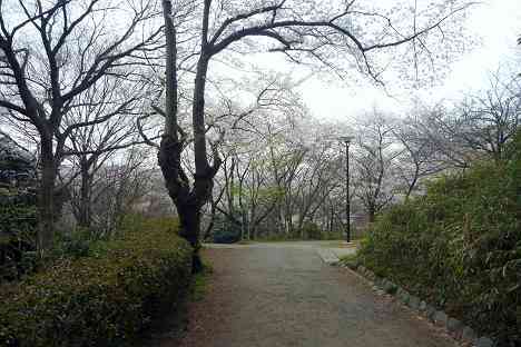 「石碑の広場」 の上の様子。広場そのものは樹木で上のコースからは見えないが桜の花は一杯。