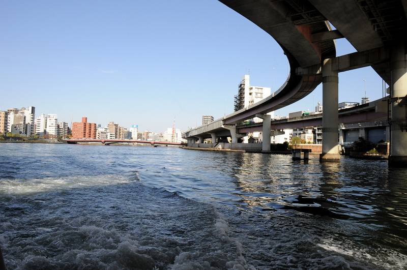 東京クルーズ 隅田川ライン リバータウン号から、両国橋と上部は首都高速6号向島線、撮影:2012年12月