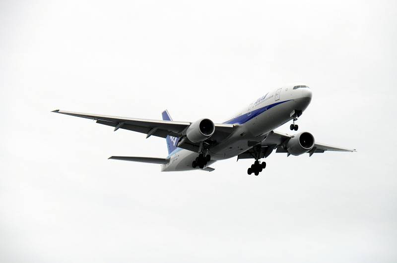 羽田B滑走路に着陸の様子を城南島海浜公園から撮影、全日本空輸(ANA)All Nippon Airways ボーイング(Boeing)B777-200 JA714A、撮影:2011年7月