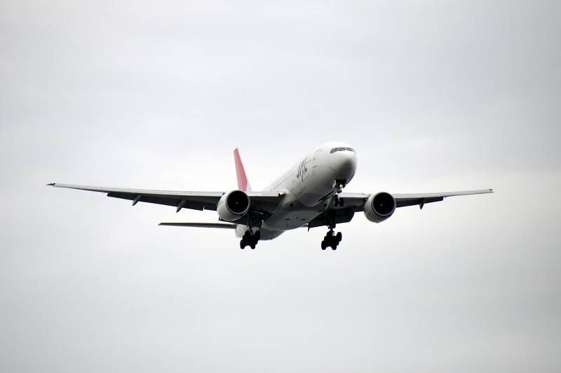 羽田B滑走路に着陸の様子を城南島海浜公園から撮影、日本航空(JAL)JAPAN AIRLINES ボーイング(Boeing)B777-200 JA8983、撮影:2011年7月