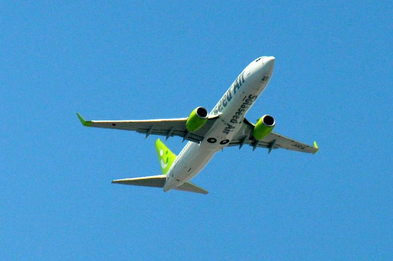羽田A滑走路から離陸の様子を浮島町公園から撮影、ソラシドエア(SNJ)Solaseed Air ボーイング(Boeing)B737-800 JA801X、撮影:2011年7月