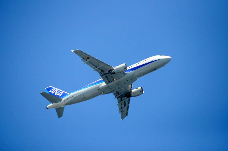 羽田A滑走路から離陸の様子を浮島町公園から撮影、全日本空輸(ANA)All Nippon Airways エアバス(Airbus)A320-200 JA8395、撮影:2011年7月