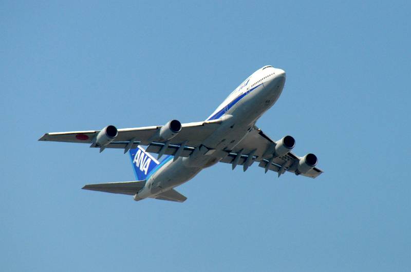 羽田A滑走路から離陸の様子を浮島町公園から撮影、全日本空輸(ANA)All Nippon Airways ボーイング(Boeing)B747-400 JA8965、撮影:2011年7月