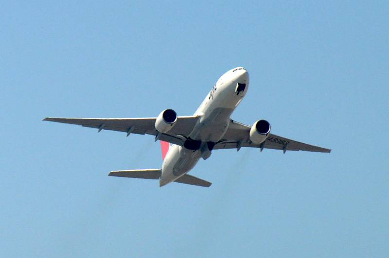 羽田A滑走路から離陸の様子を浮島町公園から撮影、日本航空(JAL)JAPAN AIRLINES ボーイング(Boeing)B777-200 JA8983、撮影:2011年7月