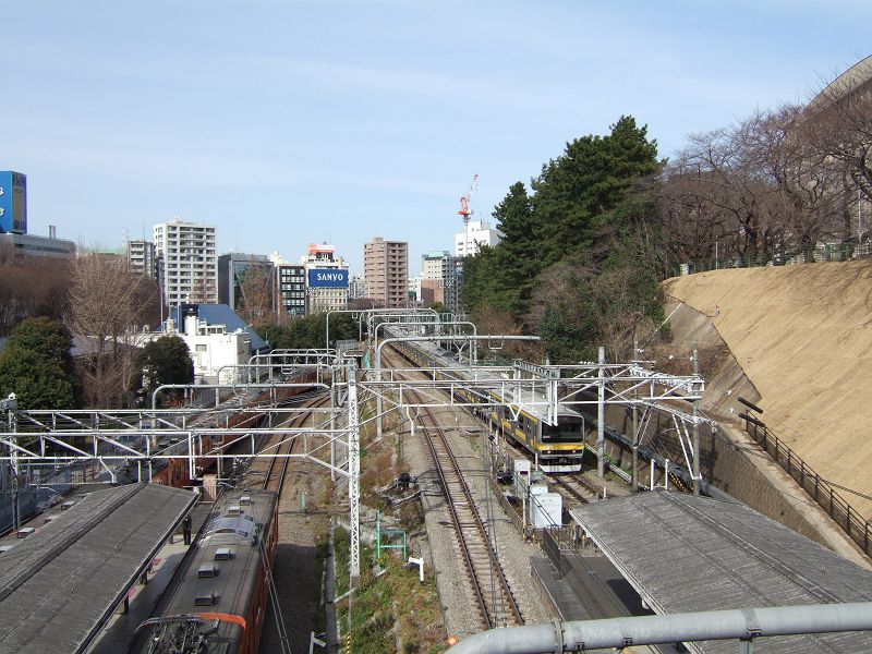 JRの電車、四谷駅前陸橋から総武線と中央線、撮影:2007年2月