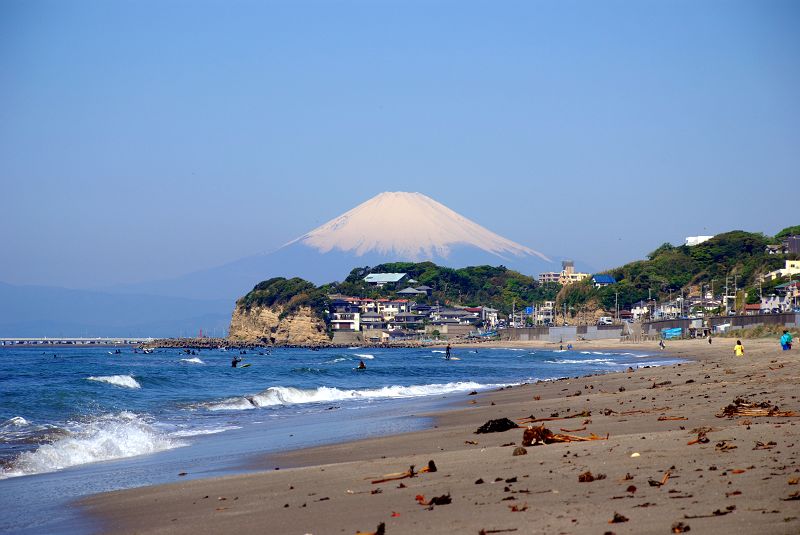 鎌倉の海岸、七里ヶ浜から富士山と小動岬(こゆるぎみさき)を望む、撮影:2007年4月