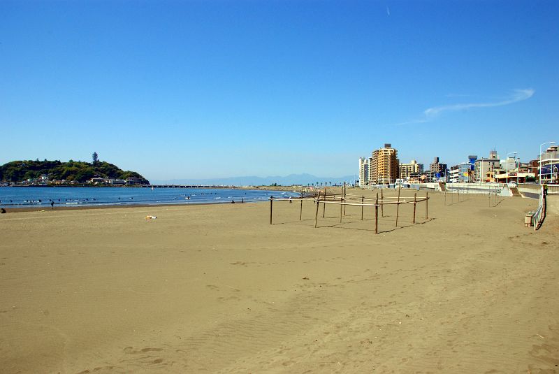 鎌倉の海岸、腰越海岸から江の島大橋を望む、撮影:2007年4月