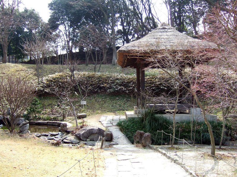 神奈川県立三ッ池公園(横浜市鶴見区)、蓬草屋根を象徴した草亭、撮影:2007年3月