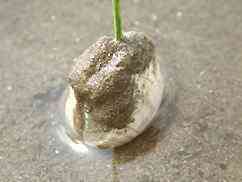 イメージとしては、入水管と出水管の分かれ目の二股の部分に(人間だったら・・・・イタタ)松葉を刺して、そのままアサリが松葉ごと水管を殻にしまうイメージです。
