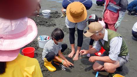 50名程の参加で最年少は3歳。でも、みんな海に来るだけあって上手にマテガイを採ります。