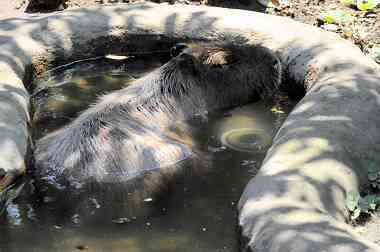 それでも今日は暑かったらしく、今度は水に浸かっていました。ネズミの仲間ですが尻尾が短く巨大で動きはおっとりしています。